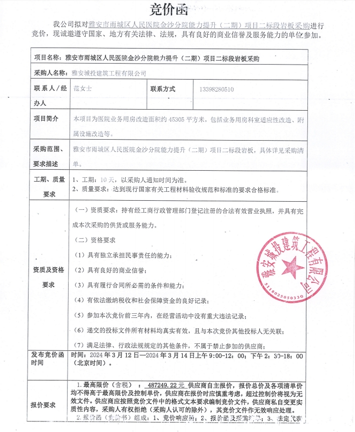雅安市雨城區(qū)人民醫(yī)院金沙分院能力提升(二期)項目二標(biāo)段巖板采購競價公告
