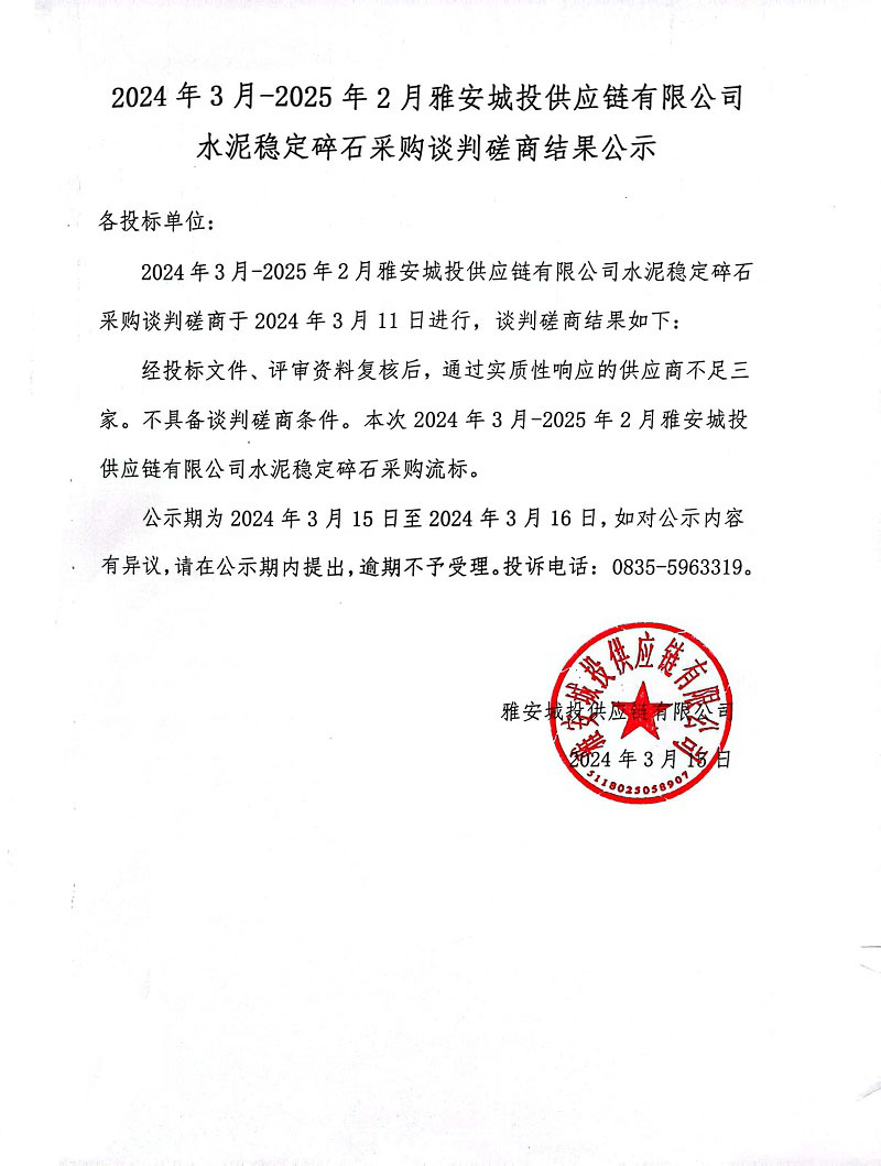 2024年3月-2025年2月雅安城投供應(yīng)鏈有限公司水泥穩(wěn)定碎石采購談判磋商結(jié)果公示