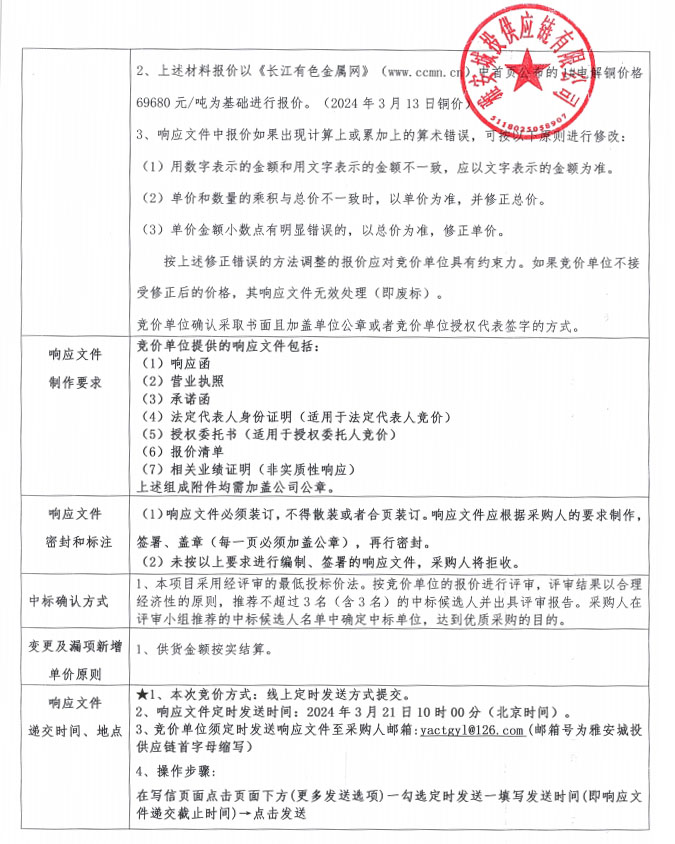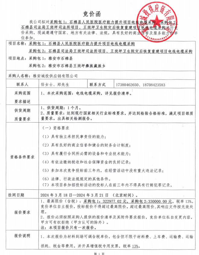 雅安城投供應(yīng)鏈有限公司電線電纜采購競價(jià)公告