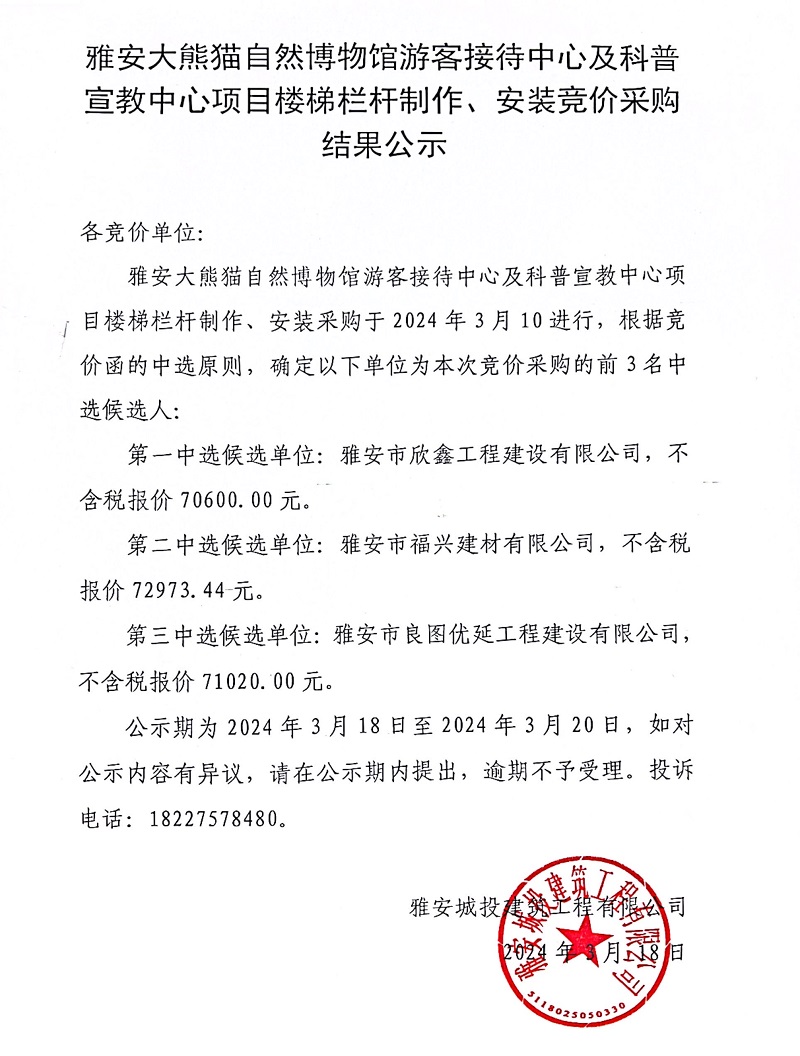 雅安大熊貓自然博物館游客接待中心及科普宣教中心項(xiàng)目樓梯欄桿制作、安裝競價(jià)采購結(jié)果公示