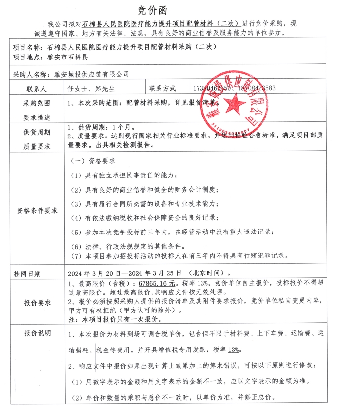 石棉縣人民醫(yī)院醫(yī)療能力提升項(xiàng)目配管材料(二次)競價公告