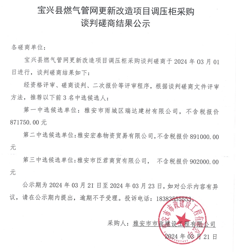 寶興縣燃?xì)夤芫W(wǎng)更新改造項(xiàng)目調(diào)壓柜采購(gòu)談判磋商結(jié)果公示