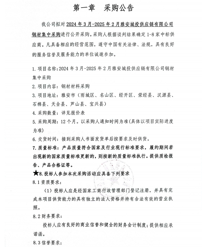 2024年3月-2025年2月雅安城投供應(yīng)鏈有限公司鋼材集中采購(gòu)公告