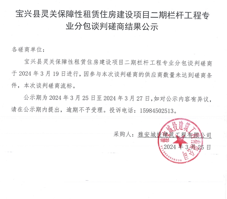 寶興縣靈關保障性租賃住房建設項目二期欄桿工程專業(yè)分包談判磋商結果公示