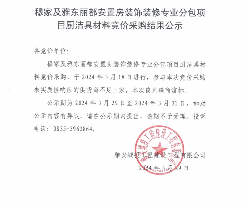 穆家及雅東麗都安置房裝飾裝修專業(yè)分包項目廚潔具材料競價采購結(jié)果公示