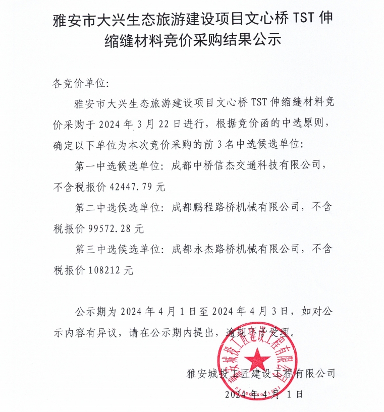 雅安市大興生態(tài)旅游建設(shè)項(xiàng)目文心橋TST伸縮縫材料競價(jià)采購結(jié)果公示