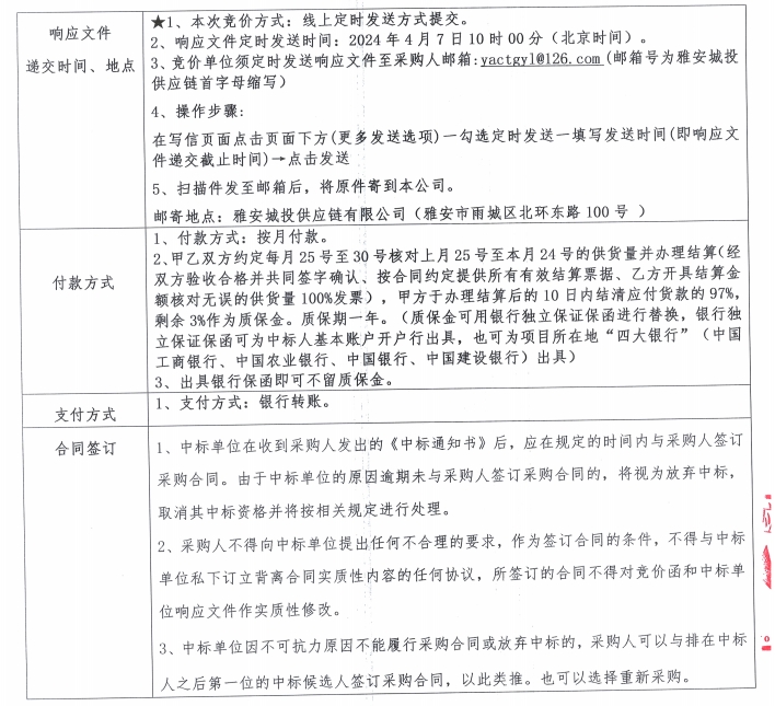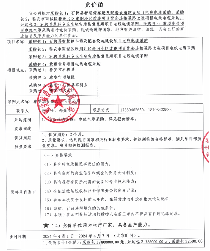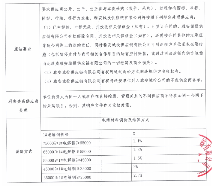 雅安城投供應(yīng)鏈有限公司電線電纜采購競價公告