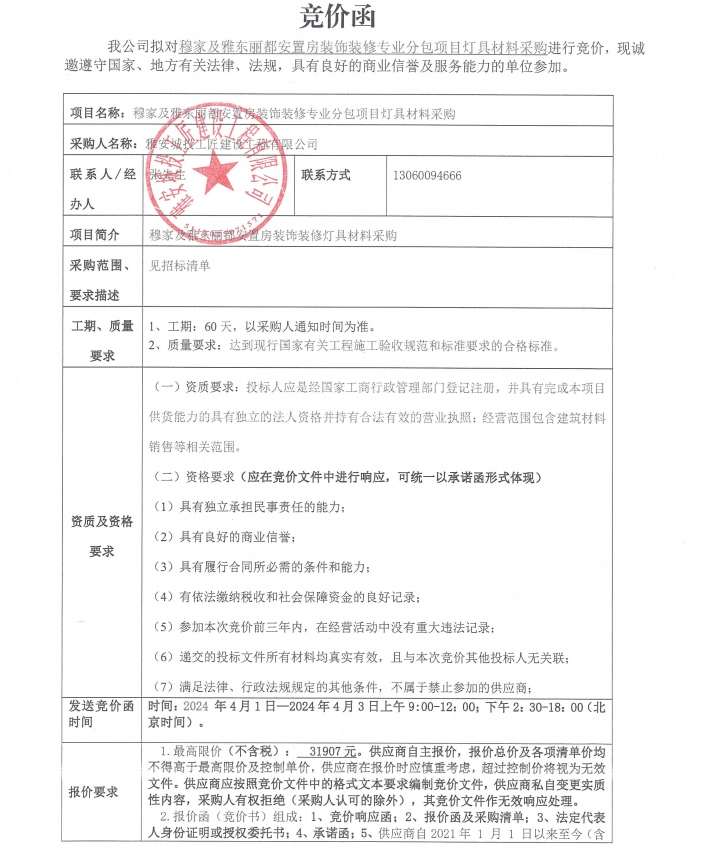 穆家及雅東麗都安置房裝飾裝修專業(yè)分包項(xiàng)目燈具材料采購競價(jià)公告