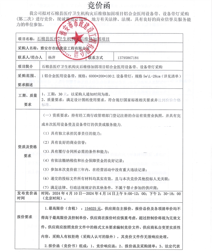 石棉縣醫(yī)療機構(gòu)災(zāi)后維修加固項目鋁合金醫(yī)用設(shè)備帶、設(shè)備帶燈采購(第二次)競價公告
