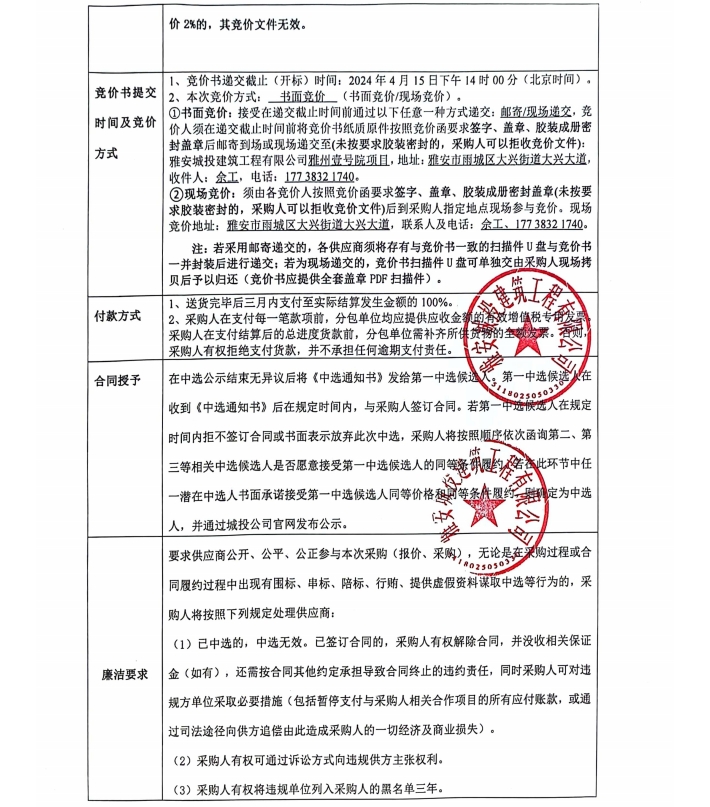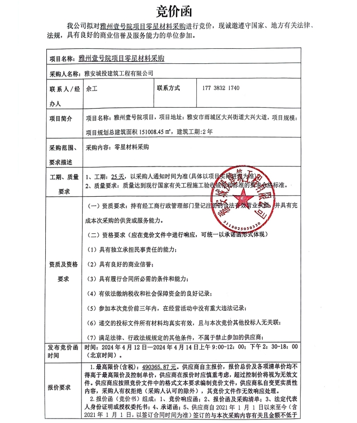 雅州壹號院項目零星材料采購競價公告