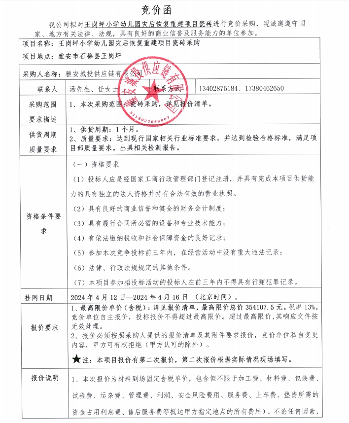 王崗坪小學(xué)幼兒園災(zāi)后恢復(fù)重建項目瓷磚競價公告