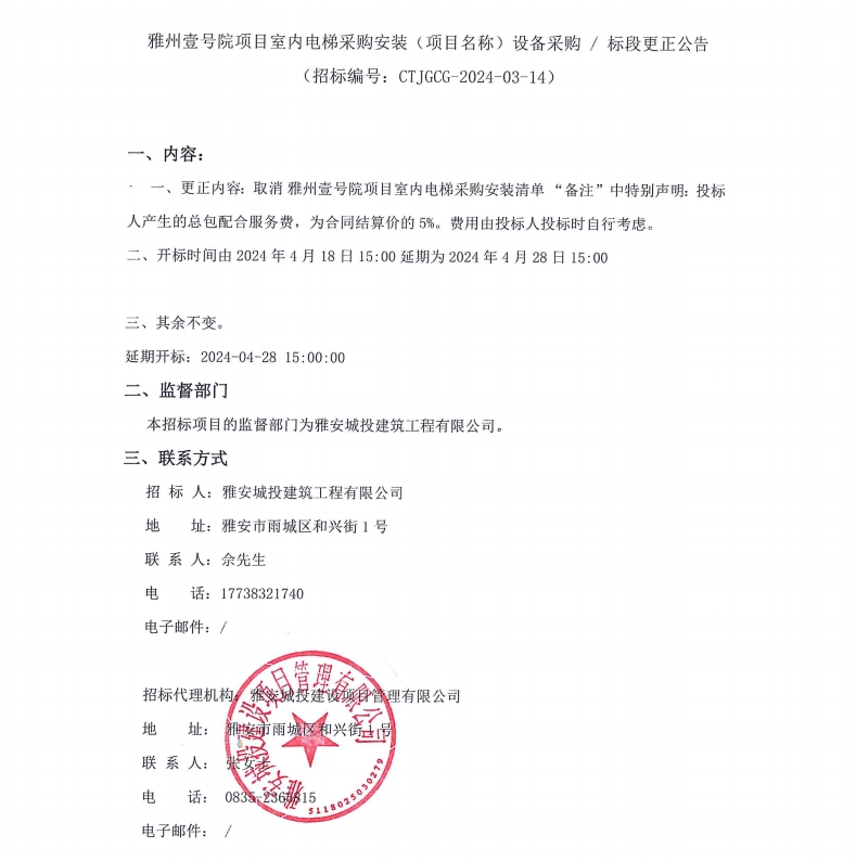 雅州壹號院項目室內(nèi)電梯采購安裝(項目名稱)設(shè)備采購/標(biāo)段更正公告