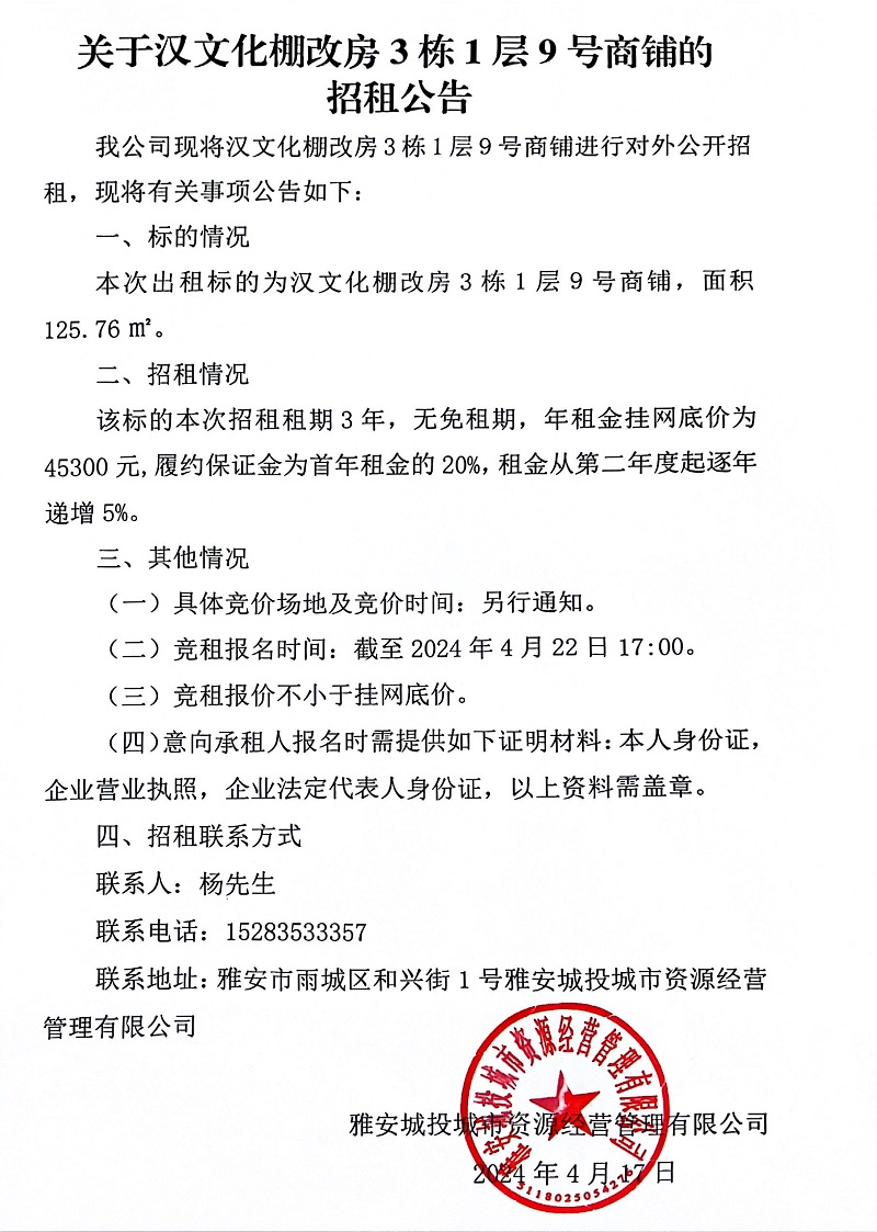 關于漢文化棚改房3棟1層9號商鋪的招租公告