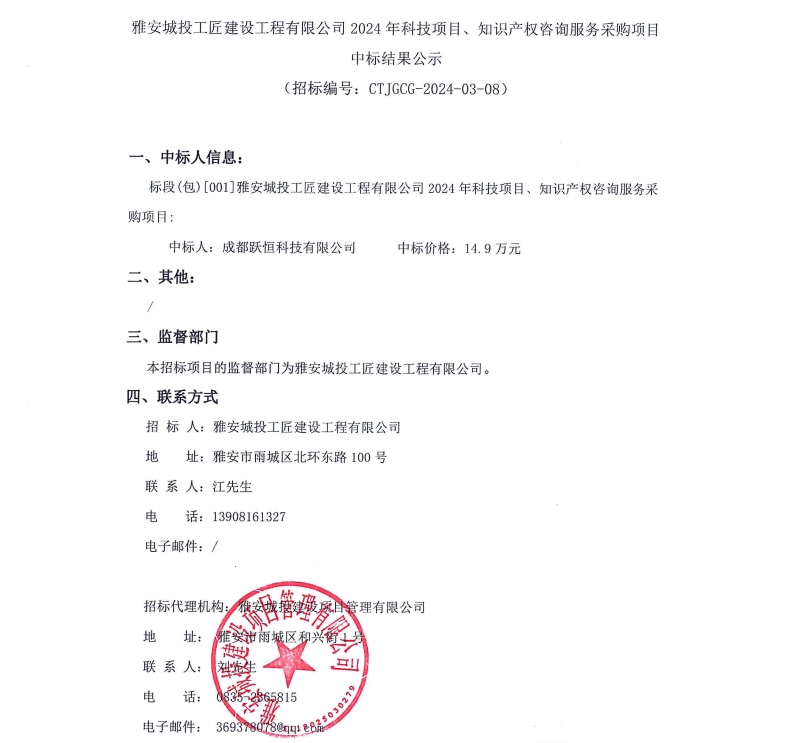雅安城投工匠建設(shè)工程有限公司2024年科技項(xiàng)目、知識產(chǎn)權(quán)咨詢服務(wù)采購項(xiàng)目中標(biāo)結(jié)果公示