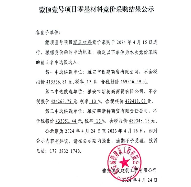 蒙頂壹號(hào)項(xiàng)目零星材料競(jìng)價(jià)采購(gòu)結(jié)果公示