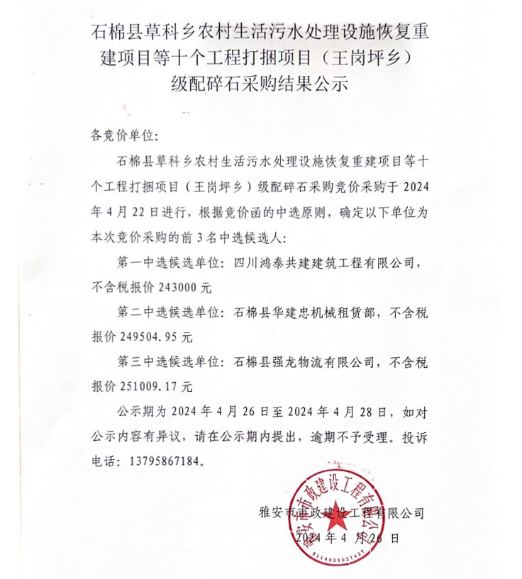 石棉縣草科鄉(xiāng)農(nóng)村生活污水處理設(shè)施恢復(fù)重建項目等十個工程打捆項目(王崗坪鄉(xiāng))級配碎石采購結(jié)果公示