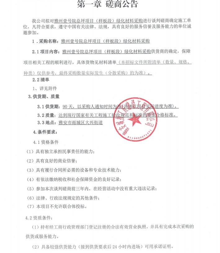 雅州壹號院總坪項目(樣板段)綠化材料采購談判磋商公告