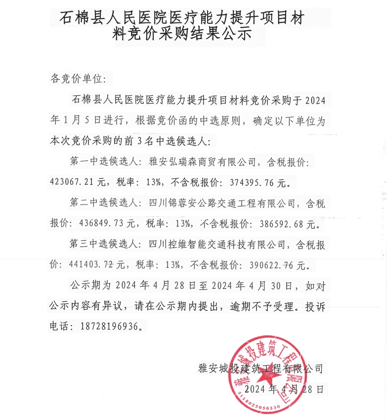 石棉縣人民醫(yī)院醫(yī)療能力提升項(xiàng)目材料競(jìng)價(jià)采購(gòu)結(jié)果公示