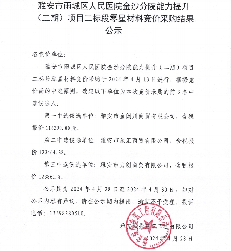 雅安市雨城區(qū)人民醫(yī)院金沙分院能力提升(二期)項(xiàng)目二標(biāo)段零星材料競價(jià)采購結(jié)果公示
