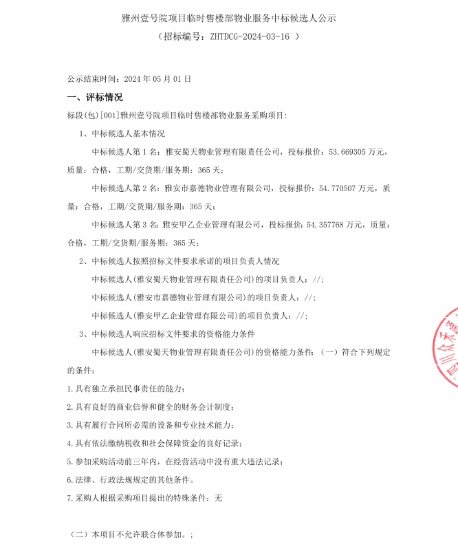 雅州壹號院臨時(shí)售樓部物業(yè)服務(wù)中標(biāo)候選人公示