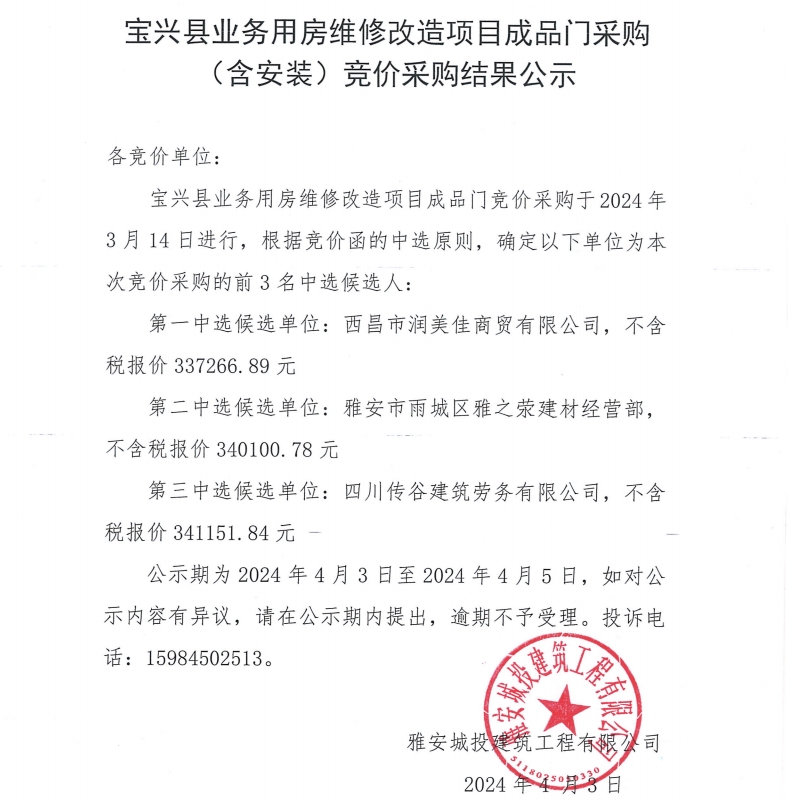 寶興縣業(yè)務用房維修改造項目成品門采購(含安裝)競價采購結果公示
