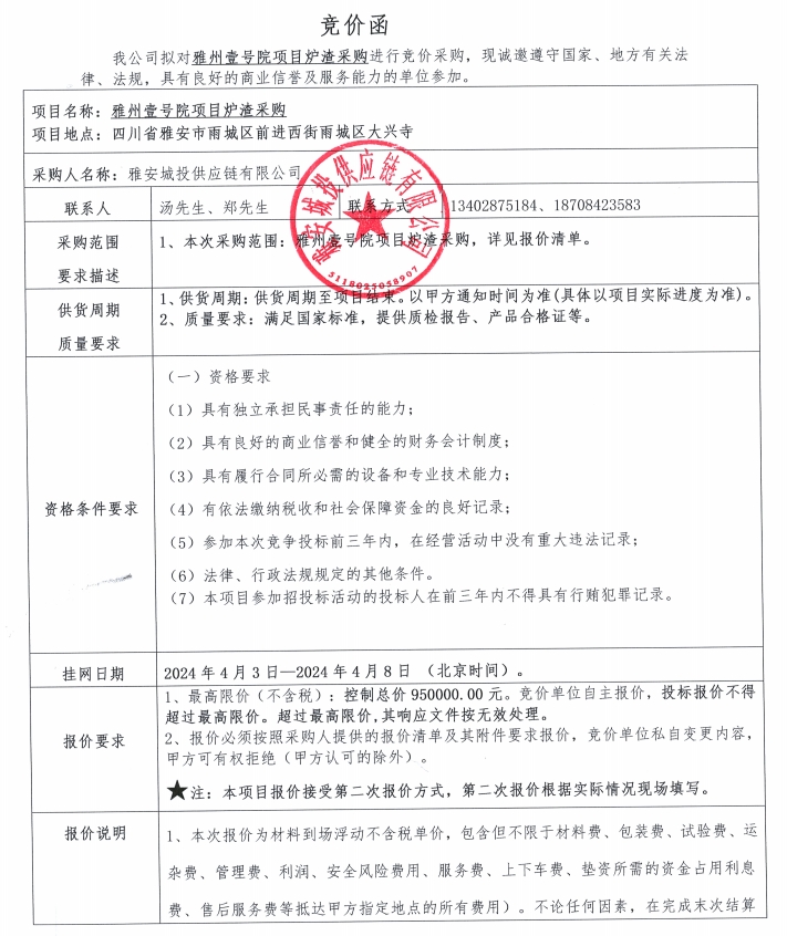 雅州壹號院項(xiàng)目爐渣采購競價公告