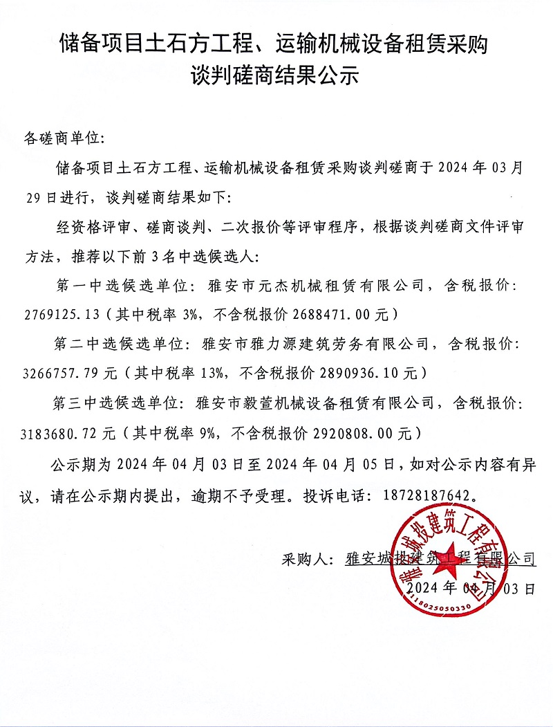 儲備項目土石方工程、運輸機械設(shè)備租賃采購談判磋商結(jié)果公示