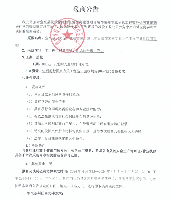 寶興縣靈關(guān)保障性租賃住房建設(shè)項(xiàng)目裝飾裝修專業(yè)分包工程勞務(wù)供應(yīng)商采購磋商公告
