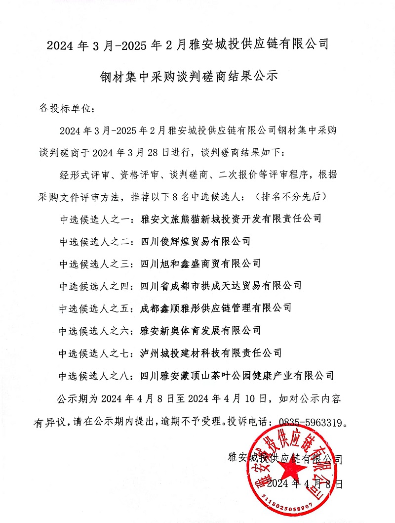 2024年3月-2025年2月雅安城投供應(yīng)鏈有限公司鋼材集中采購談判磋商結(jié)果公示