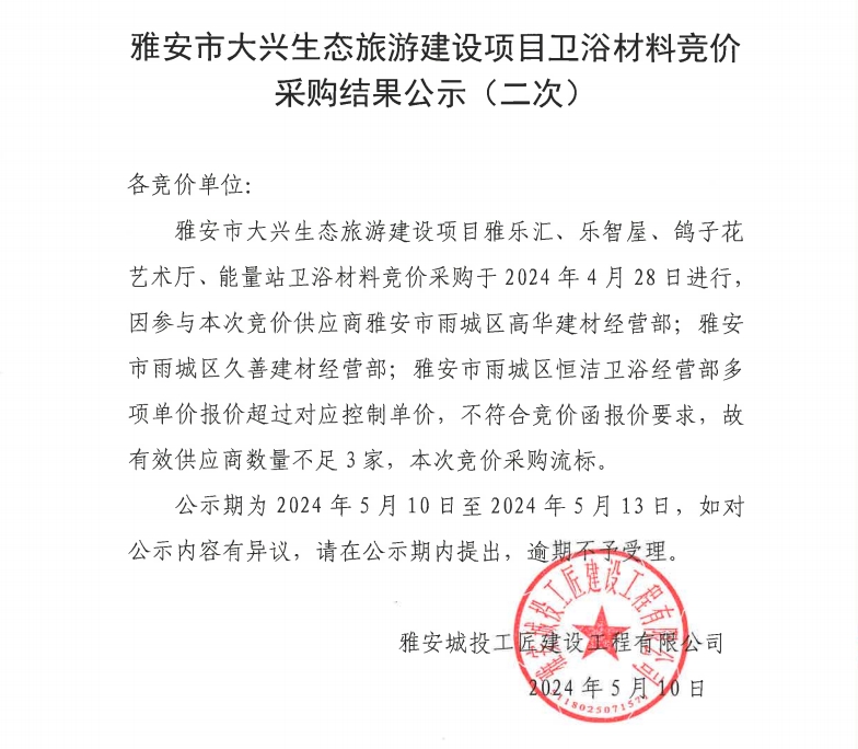 雅安市大興生態(tài)旅游建設(shè)項目衛(wèi)浴材料競價采購結(jié)果公示(二次)
