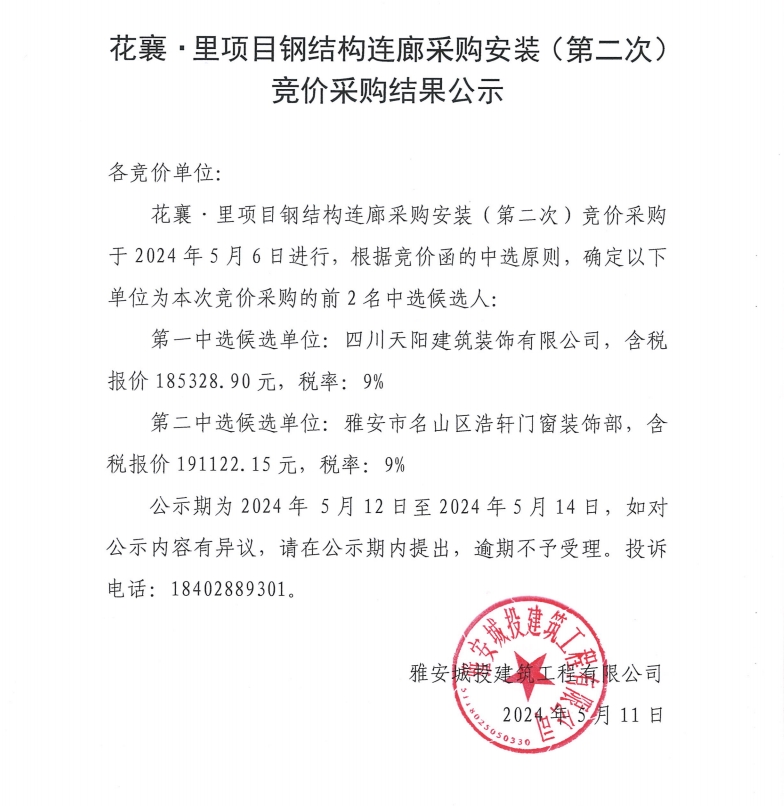 花襄·里項(xiàng)目鋼結(jié)構(gòu)連廊采購安裝(第二次)競價(jià)采購結(jié)果公示