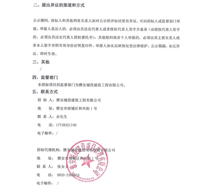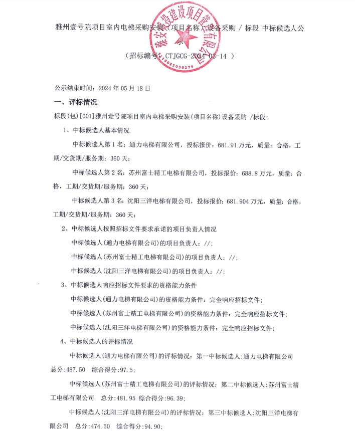 雅州壹號院項目室內電梯采購安裝(項目名稱)設備采購/標段中標候選人公示