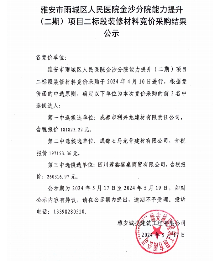 雅安市雨城區(qū)人民醫(yī)院金沙分院能力提升(二期)項(xiàng)目二標(biāo)段裝修材料競(jìng)價(jià)采購結(jié)果公示