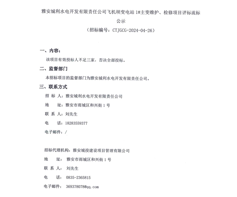 雅安城利水電開發(fā)有限責任公司飛機壩變電站1#主變維護、檢修項目評標流標公示