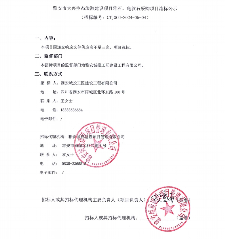 雅安市大興生態(tài)旅游建設(shè)項(xiàng)目雅石、龜紋石采購(gòu)項(xiàng)目流標(biāo)公示