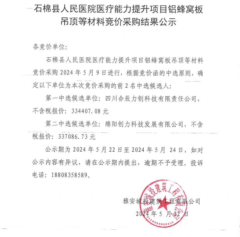 石棉縣人民醫(yī)院醫(yī)療能力提升項目鋁蜂窩板吊頂?shù)炔牧细們r采購結(jié)果公示