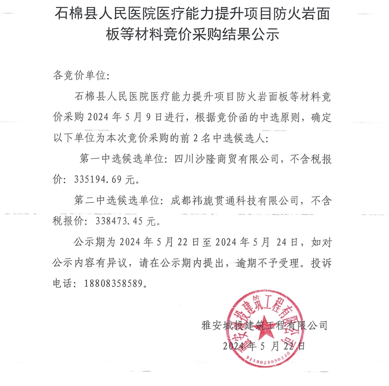 石棉縣人民醫(yī)院醫(yī)療能力提升項(xiàng)目防火巖面板等材料競價(jià)采購結(jié)果公示