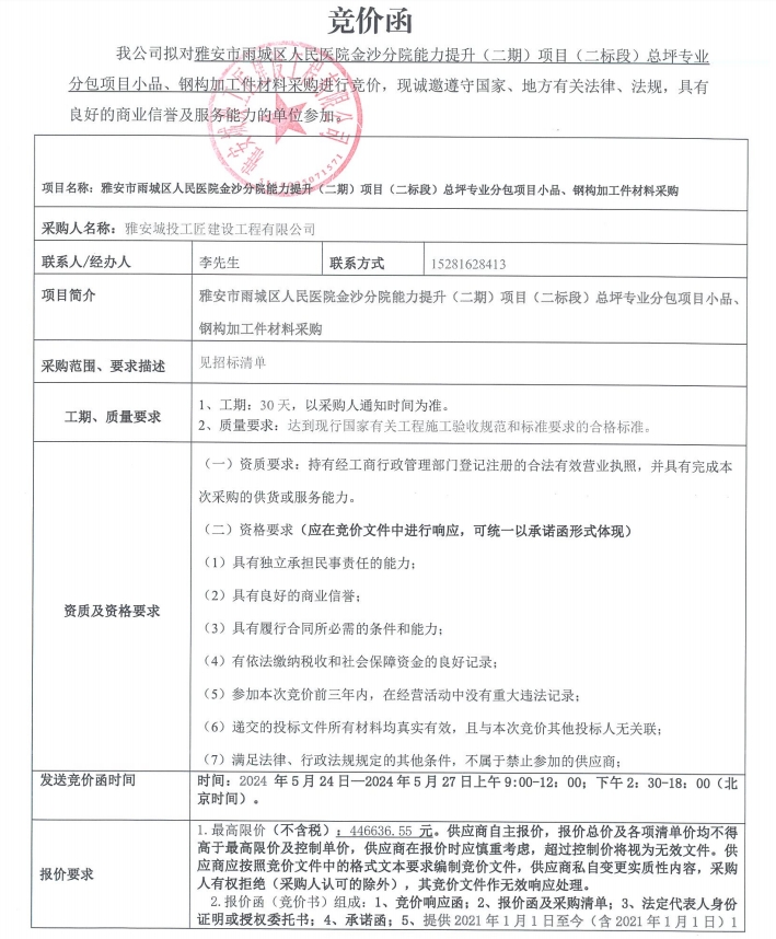 附件1:雅安市雨城區(qū)人民醫(yī)院金沙分院能力提升(二期)項(xiàng)目(二標(biāo)段)總坪專業(yè)分包項(xiàng)目小品、鋼構(gòu)加工件材料采購(gòu)競(jìng)價(jià)函