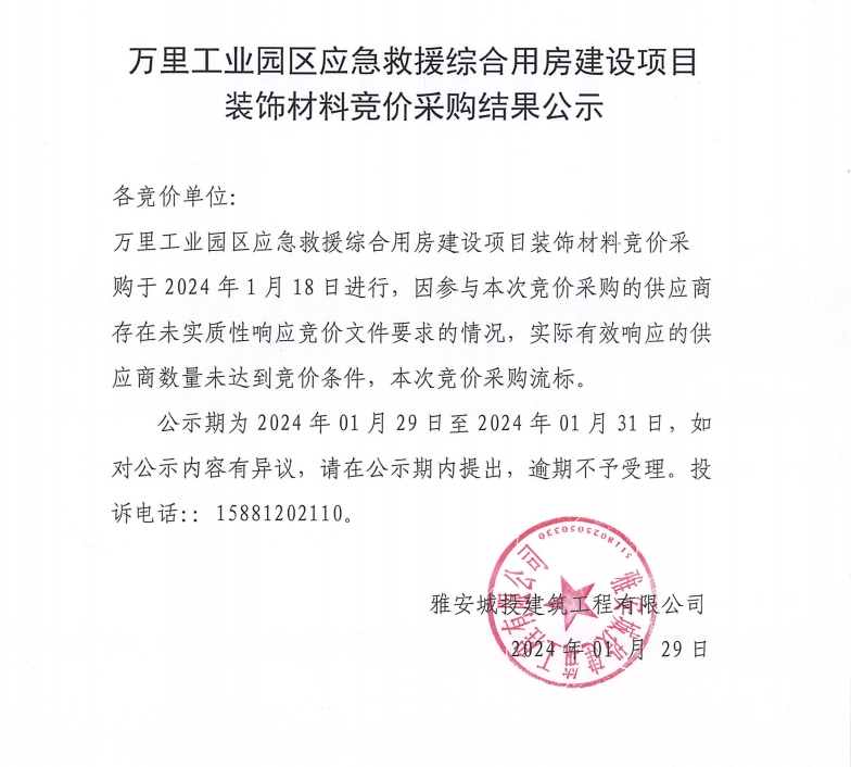 萬里工業(yè)園區(qū)應急救援綜合用房建設項目裝飾材料競價采購結(jié)果公示