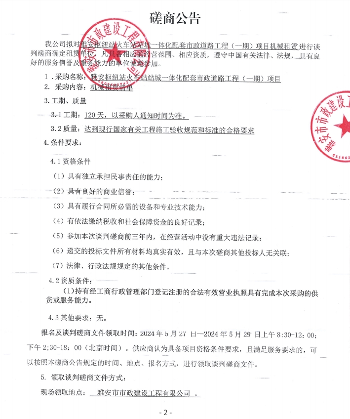 雅安樞紐站火車站站城一體化配套市政道路工程(一期)項目機械租賃磋商公告