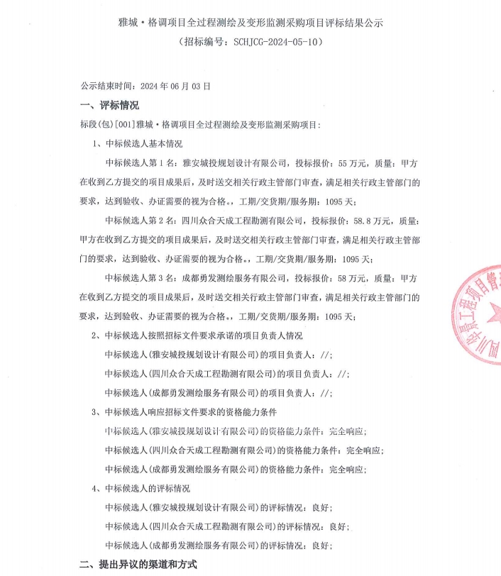 雅城·格調(diào)項(xiàng)目全過程測繪及變形監(jiān)測采購項(xiàng)目評標(biāo)結(jié)果公示
