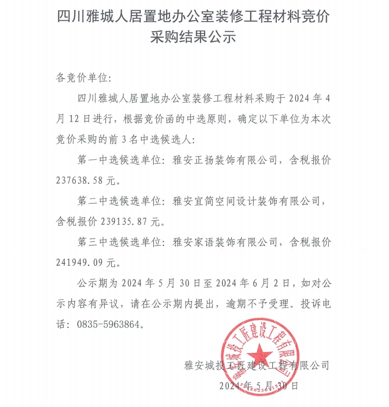 四川雅城人居置地辦公室裝修工程材料競價采購結果公示
