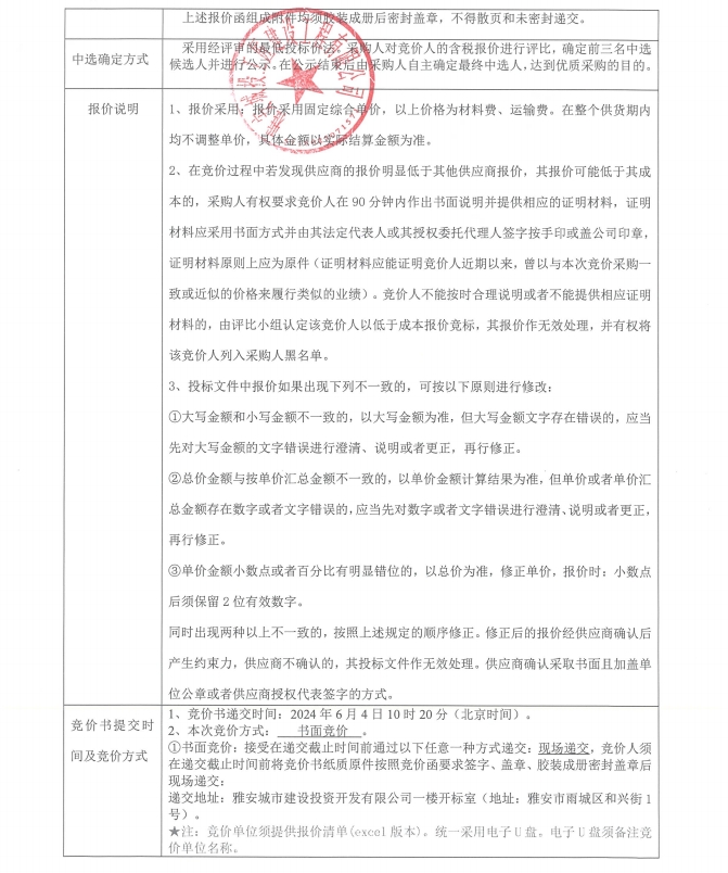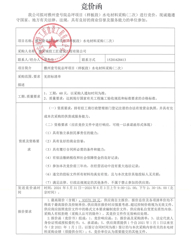競價函-雅州壹號院總坪項目(樣板段)水電材料采購