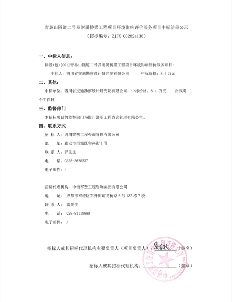 青鼻山隧道二號及附屬橋梁工程項目環(huán)境影響評價服務(wù)項目中標結(jié)果公示
