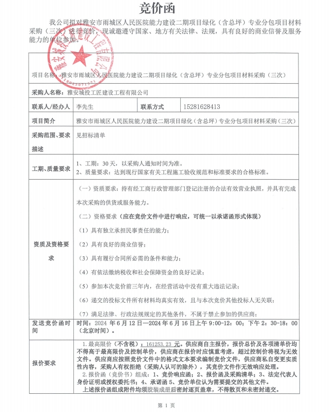 雅安市雨城區(qū)人民醫(yī)院能力建設二期項目綠化(含總坪)專業(yè)分包項目材料采購(三次)競價公告