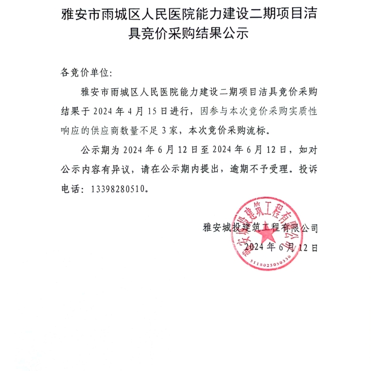 雅安市雨城人民醫(yī)院能力建設二期項目潔具競價采購結果公示
