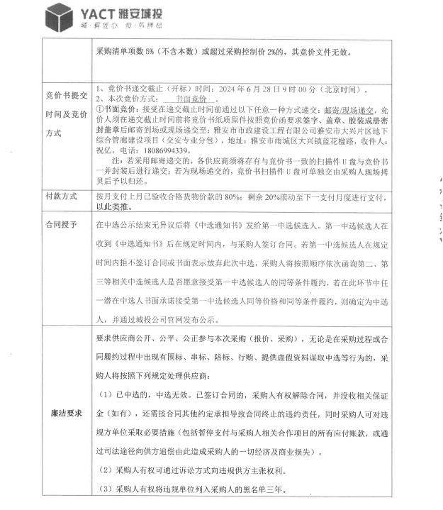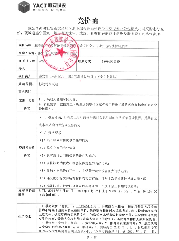 雅安市大興片區(qū)地下綜合管廊建設(shè)項目交安專業(yè)分包標線材料采購競價公告