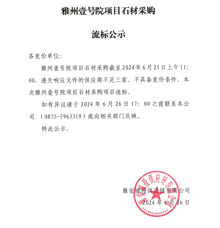 雅州壹號院項(xiàng)目石材采購流標(biāo)公示