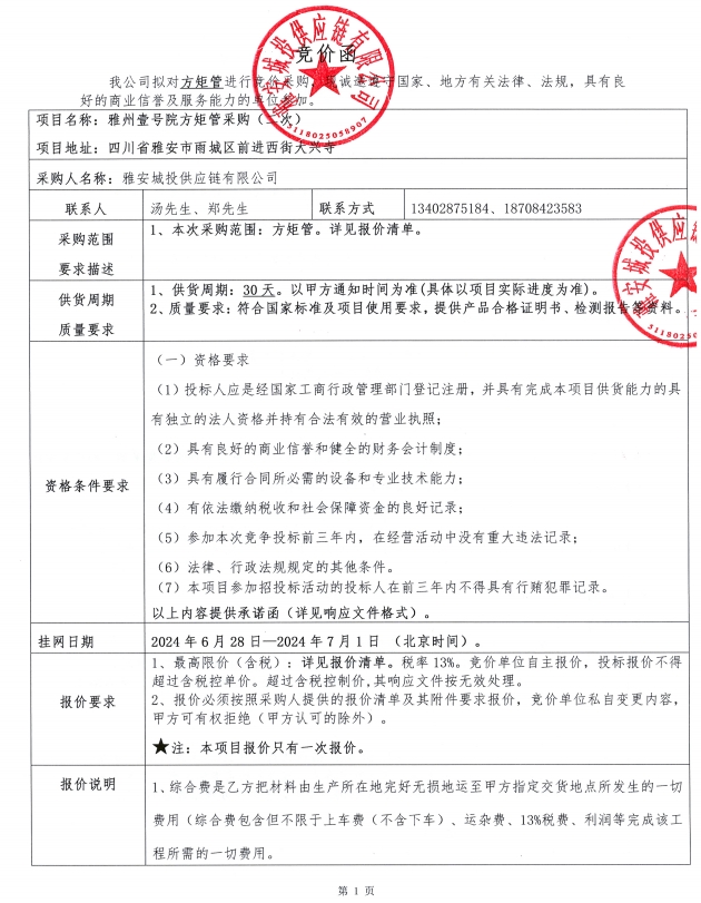 響應(yīng)文件格式-雅州壹號院方矩管采購(二次)