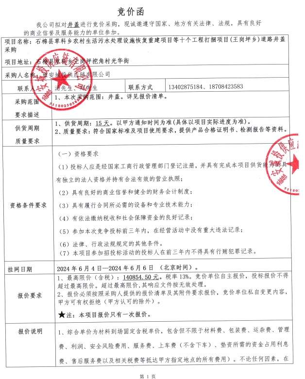附件1:競(jìng)價(jià)函--石棉縣草科鄉(xiāng)農(nóng)村生活污水處理設(shè)施恢復(fù)重建項(xiàng)目等十個(gè)工程打捆項(xiàng)目(王崗坪鄉(xiāng))道路井蓋采購(gòu)